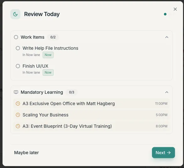 Night-Before Review set tomorrow up, gently.